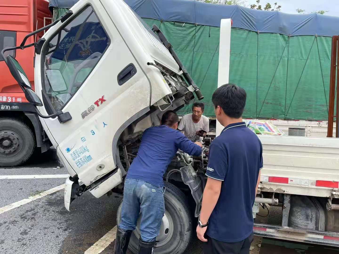 福田奧鈴輕卡鄭州榮發店在確保全體員工安全的前提下,第一時間組織救援隊伍,參與受災嚴重地區的救援工作。7月21日上午,奧鈴輕卡救援服務隊接到求助信息,迅速趕往事發地,救助了一位在水中被困兩天一夜的奧鈴輕卡司機,為客戶清理積水,更換濾芯,重新啟動車輛。